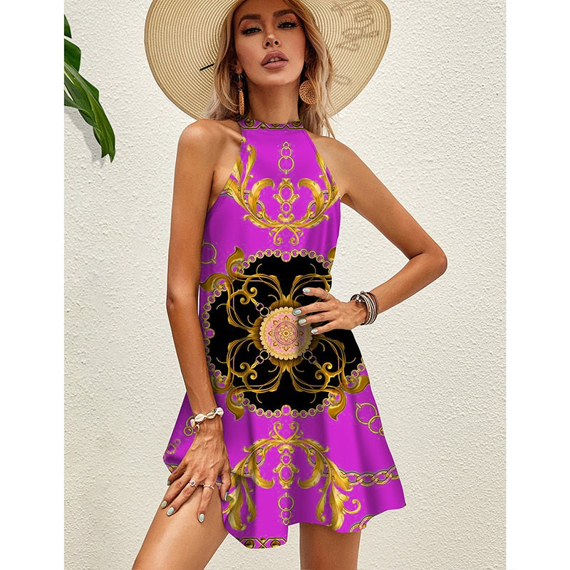This sexy dress features open back,3d Print,deep v-neck,sleeveless,loose fit and back criss-cross detail throughout.Very unique and individual design.