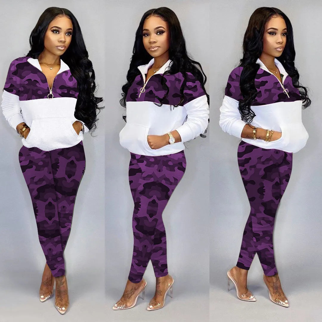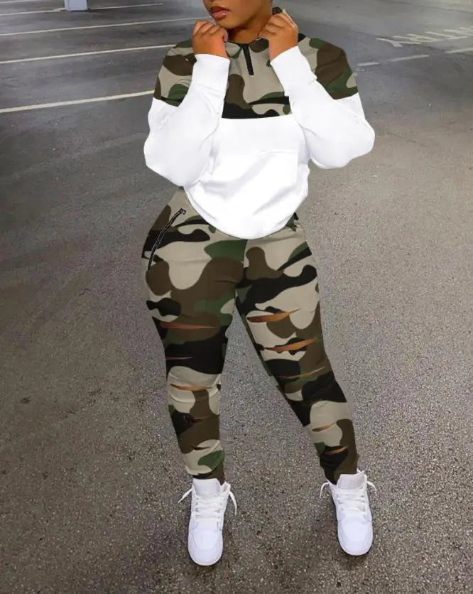 Two Piece Sets Casual Camo Print Long Sleeve Top Cutout Pants Set Sweatpants Sweatshirt Sets