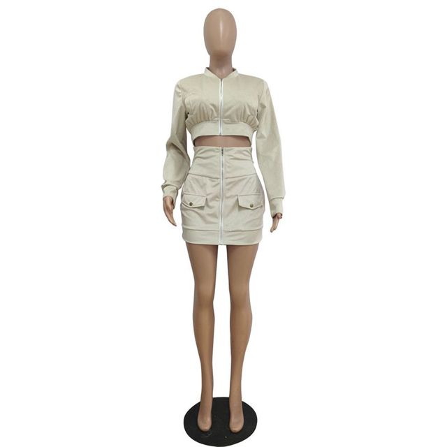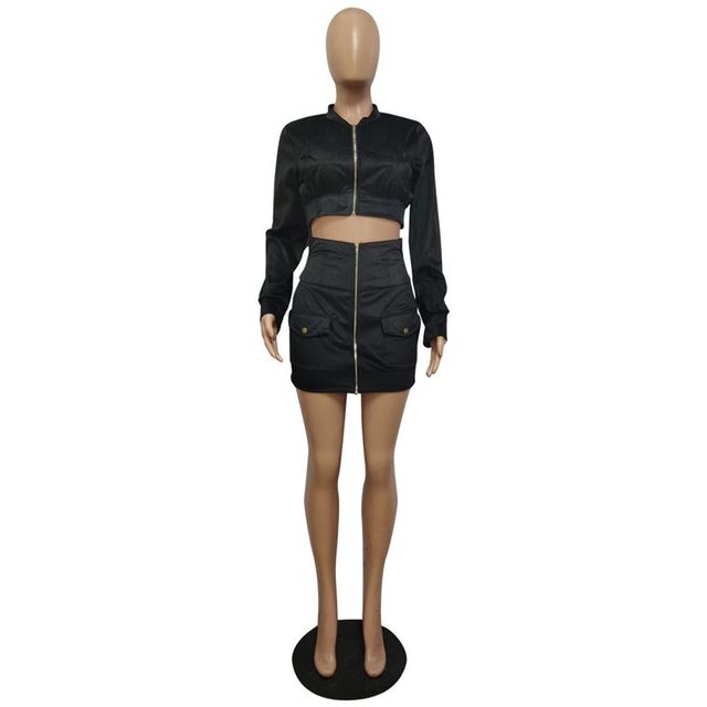 Two Piece Set Women Autumn Winter Outfits Zip Crop Top Mini Skirt