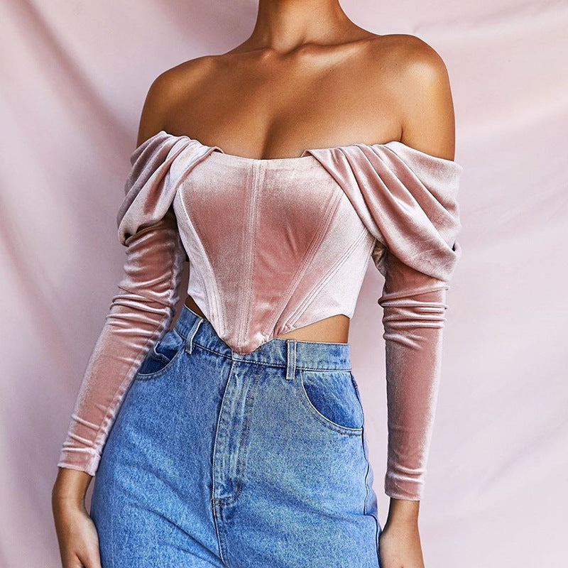 Explosive Fall And Winter Velvet Off-Shoulder Collar Pleated Long-Sleeved Top T-Shirt Women